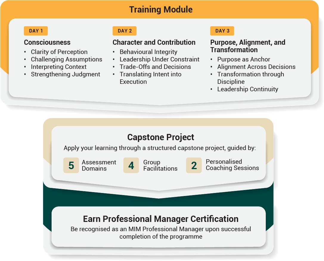 This certification programme is grounded in the MIM Leadership Model, a data-driven framework integrating four key dimensions of leadership: Consciousness, Character, Contribution, and Purpose-driven Alignment. It is designed to transform managers from operational capability to leading outcomes that drive measurable business results. Delivered over 60 hours across six months, this work-based programme combines a three-day intensive training with guided facilitation and personalised coaching. This ensures that learning is not only practical and immediately applicable, but also sustained through consistent application and measurable performance.